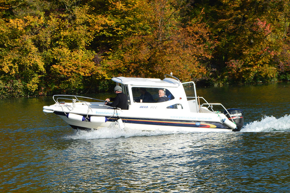 Unsere Bella 571 mit 60PS Außenbordermotor ist bestens geeignet, um die erforderlichen Manöver zu trainieren. Vor Wind und Wetter geschützt, ist es ein wendiges, übersichtliches Boot mit Kabine und Heizung.